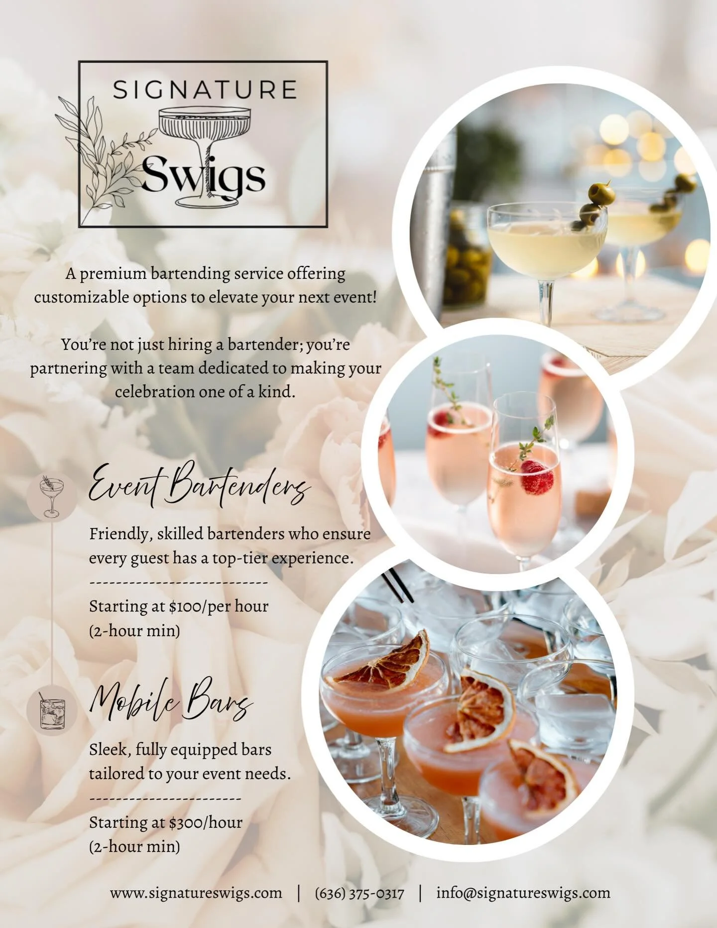 Black background logo with gold border, featuring a gold cocktail glass illustration, and the words 'Signature Swigs' and 'Swigs' in white text.